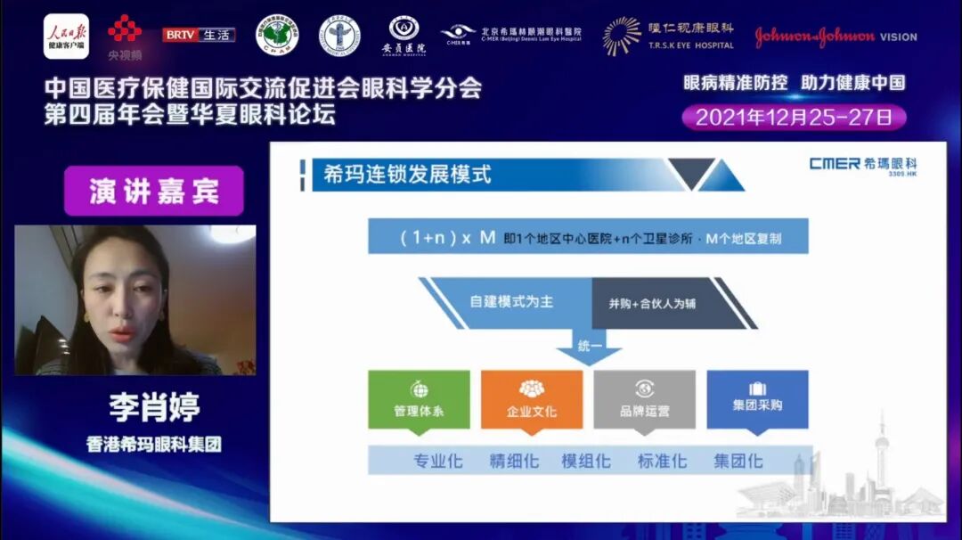 通过引进香港先进的服务理念,希玛眼科执行总裁李肖婷在医疗企业管理上敢闯敢试、敢于创新。本次眼科管理论坛,李肖婷通过香港眼科集团品牌连锁经营探索的分享,与嘉宾共同探讨经营之道。李肖婷用“专业化、精细化、标准化、集团化、产业化”来概述希玛的连锁发展模式。2021年开始,希玛以“眼+”的战略进入高速增长阶段,推动香港专科医疗服务的整合,包括口腔、肿瘤、家庭医学和其他专科,目标是建立一个多专科、多层次的港式医疗服务生态圈。